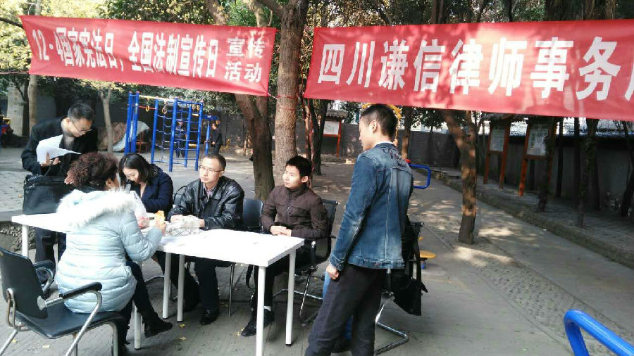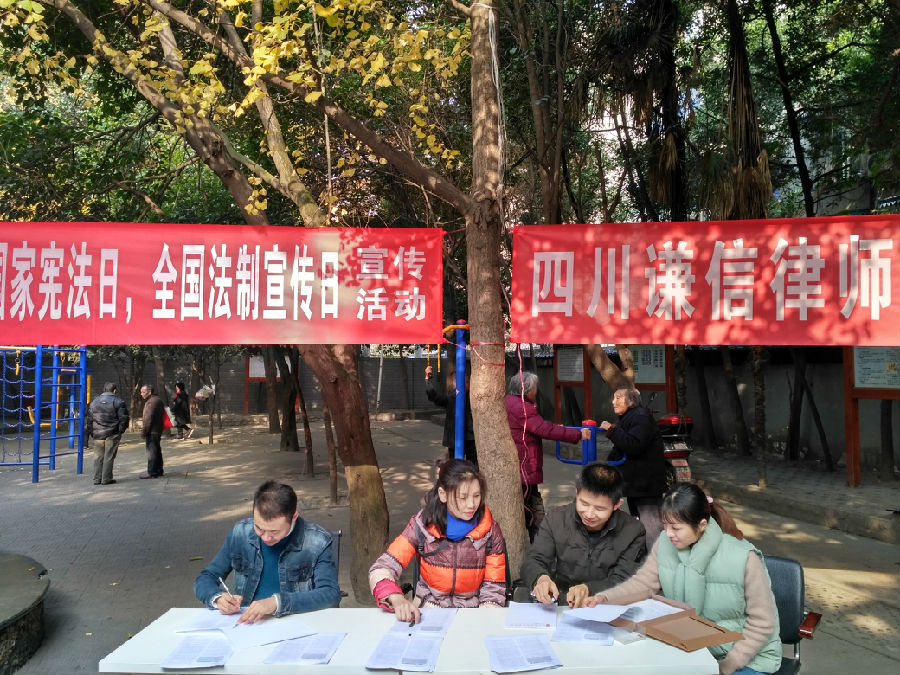 今天(12.4)是第四个“国家宪法日”,也是第十七个“全国法制宣传日”。为深入学习宣传宪法和贯彻党的十九大精神,充分发挥律师在服务民生中的专业优势,展示律师良好风貌。四川谦信律师事务所结合行业实际,以“弘扬国家宪法精神,助力法治成都建设”为抓手,提高全民法制意识,并激发我所律师的责任感和使命感。由成都市、区律协部署,事务所组织,罗文方副主任带队,张建平、石莉、倪军、魏海强、姚宜敏、曾涛春、岳强、辜睿、蹇龙等部分律师和办公室行政人员黄娟、胡媛十余人,深入成都抚琴西南路社区、街道等基层,进行现场法律咨询、普法宣传、义务宣讲等多形式的法制宣传活动。律师们不忘初心,牢记使命,大力宣讲宪法、十九大精神、全面依法治国和义务法律咨询,受到社区居民的一致好评。