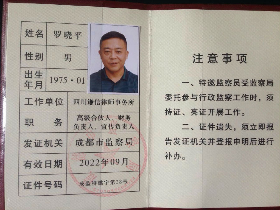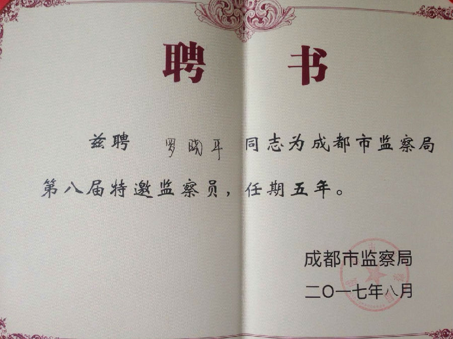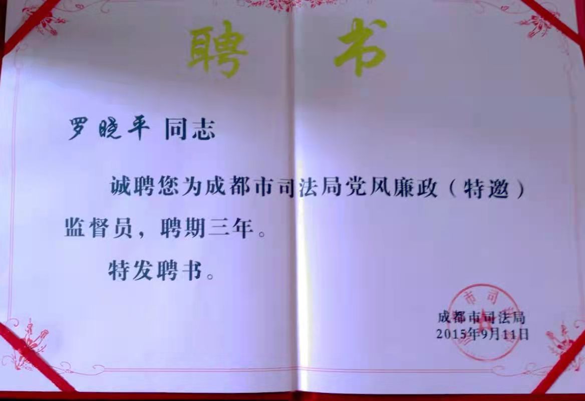 罗晓平副主任律师被成都市监察局聘为第八届“特邀监察员”